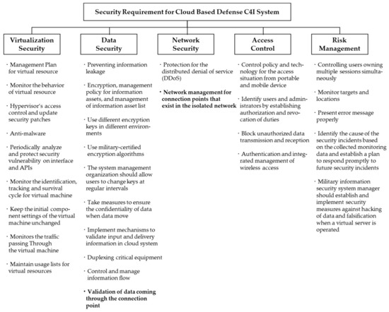 Cloud computing has excellent scalability. The cloud can efficiently operate limited physical resources by dividing server performance and storage space; therefore, cloud computing is a representative infrastructure for implementing a big data system characterized by the 6V’s. Our research group previously studied the security requirements for a cloud-based defense C4I system [40,41]. To derive the security requirements in our prior research, we referenced the security requirements identified by the Security Controls Baseline (FedRAMP) [42], Cloud Computing Security Requirements Guide (DISA) [43], Security Certification Guide for Cloud Service (Korea Internet and Security Agency) [44], Security Requirements for Server Virtualization System (Telecommunications Technology Association) [45], and the Security Guidelines of National and Public Institution for Cloud Computing (National Intelligence Service) [46]. The requirements consist of five categories with 28 items; virtualization security (9 items), data security (9 items), network security (1 item), access control (4 items), and risk management (5 items) [40]. In this paper, two additional items for the connection point are proposed. Physical contacts with different levels of C4I systems or the Internet in the data generation layer exist in the data center’s infrastructure. Therefore, two items were added: verification of data flowing through connection points for data security and security management of connection points existing in the isolated network in network security. The added contents are displayed in bold font in Figure 5.