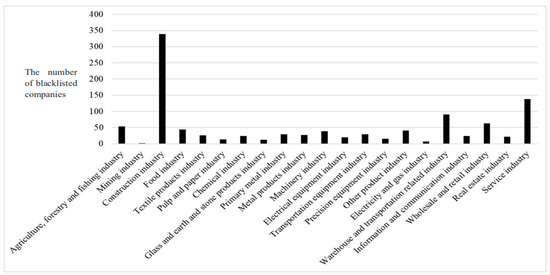 To define the independent variable—vicarious public disgrace—we counted the annual number of industry peers who experienced public disgrace, that is, the peers who were publicly blacklisted by the Japanese government due to labor law delinquency. Figure 1 shows the average number of blacklisted firms throughout the sample period by industry. Many blacklisted firms were pooled from the construction industry, which has often been criticized for its harsh working conditions in Japan [51].