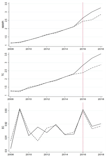 The mean square error ratio test shows that the NMWPI of Hebei and the mean square error ratio of the TC are both the maximum values of 90 and 75, respectively. Therefore, the policy effect is significant for both. Through the analysis above, the WRTR policy has statistical significant effect for the NMWPI and TC, but no significant effect on EC. As the goal of this policy, water performance has improved. Through ML decomposition, we can know that the increase in the total factor productivity of water resources seems to come from technological progress (TC) rather than technological efficiency (EC). This may result from the policy objective of the WRTR policy being to raise the tax standards for the high water consumption by industry and excess use areas where groundwater is over-exploited but to maintain necessary production and domestic water. As the cost of water increases, firms have to improve their technical level, such as buying more advanced equipment and reusing more wastewater so TC has a big rise. Because Hebei Province is more heavy industry, in the case of rapid economic development in China, there is a certain demand for heavy industrial products. In addition, special industries, such as car washing and golf courses, belong to the service industry, and they are becoming an indispensable part of life. These reasons may lead to the unchanged EC.
