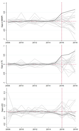 We estimate the synthetic Hebei as a linear combination of outcomes of the 21 control provinces by using SCM. Thereby, we obtain optimal weights for each province separately. Table 5 reports the estimated weights. Through the optimal weight, we can construct “Hebei Province without WRTR”—synthetic Hebei Province. The control units of Qinghai and Jiangxi best resemble Hebei in terms of water performance index (NMWPI); Yunnan and Fujian in terms of technical efficiency (EC); Guangdong and Qinghai in terms of technical change (TC). The SCM provides unbiased counterfactual estimates if the predictor variables as well as the outcomes of the treated unit are sufficiently close to those of the synthetic unit pre-treatment. If the predictor variables and outcomes of the treated unit are sufficiently close to those of the synthetic unit pre-treatment, we can think that the SCM provides unbiased counterfactual estimates. Table 6 compares the average values of the covariates between real Hebei and synthetic Hebei and 21 provinces before the implementation of the water tax in 2016. It can be seen that the average values of the covariates of the synthetic Hebei and the real Hebei are very close, which is much smaller than the difference between the average of the covariates of the 21 provinces and the real Hebei. This table shows that, compared to the sample average assigning equal weights to all control units, synthetic Hebei is most similar to Hebei in terms of outcomes and predictor averages. Although the proportion of primary industry, the proportion of secondary industry, and the per capita water supply are slightly different from the real variables, the difference between the mean values of other covariates is very small, and the real Hebei and the synthetic Hebei before the policy are almost the same in the NMWPI, TC, and EC in 2009, 2011, and 2014. This shows that the synthetic control method does fit the characteristics of Hebei Province well before the pilot of WRTR, and the change path of the NMWPI, TC, and EC in the synthetic Hebei fits the real path well. Therefore, it is appropriate to use the synthetic control method to evaluate the effect of the WRTR policy. Based on annual panel data for 21 provinces in 2018, we uses the synthetic control method to evaluate the short-term impact of the WRTR on water resources performance in Hebei Province. Figure 1 shows the outcome fit in each time period, and a vertical dotted line that separates the pre-treatment from the post-treatment periods in 2016. Before the implementation of the WRTR policy in 2016, synthetic Hebei fitted the trend of the NMWPI, TC, and EC of real Hebei well. The gaps in the change path of the NMWPI, TC, and EC between synthetic Hebei and real Hebei were very small, which indicated that synthetic Hebei controlled the influence of unobserved factors or missing variables well (including unobserved factors changing at any time). Therefore, if there is no WRTR policy in Hebei, the changes in the NMWPI, TC, and EC of Hebei after 2016 can be fitted with the changes of the NMWPI, TC, and EC of synthetic Hebei, that is, the NMWPI, TC, and EC of synthetic Hebei can be considered as the counterfactual results of NMWPI, TC, and EC of real Hebei. Thus, after the implementation of WRTR, the difference of NMWPI, TC, and EC between the real Hebei and the synthetic Hebei is the policy effect of the water resource tax.