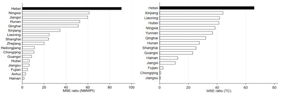 Another form of the placebo test is to calculate the distribution of the ratio of “Post period-MSPE” to “Pre period-MSPE” [11,35]. The basic logic is that, if the WRTR policy is effective, the synthetic control method will not be able to predict the real post-treated NMWPI, TC, and EC of Hebei province, resulting in a larger Post-period MSPE. However, before the policy is implemented, if synthetic Hebei cannot predict the outcome variable of real Hebei well (larger MSPE before intervention), which will also lead to a lager MSPE after intervention, then the ratio of the two can be used to control the disturbance of the former. Therefore, the significance of the treatment effect can be well recognized by the ratio of Post-period MSPE/Pre-period-MSPE. That is, if the WRTR policy in Hebei does have a larger effect, the placebo effect of other provinces is relatively lower; in Figure 3, we can observe that the Post-period MSPE/Pre-period-MSPE of Hebei province is higher than that of the other provinces.