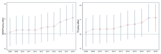 Finally, we employ the conventional policy evaluation method, DID, to estimate the policy effect. The treated unit is only one province in Hebei, the treated variable Hebei is 1. In other provinces, the time variable is set to 0 before 2016, 1 after 2016, and the DID terms are treat and time interactions, indicating the effect of the policy implementation. Table 7 reports the results estimated using the DID method; as you can see, the WRTR policy has achieved statistically significant results, the NMWPI is approximately increased by 63.9%, the TC increased 83.0 percent, and similar to the synthetic control estimates, the change in EC is not statistically significant and other control variables are the same with the synthetic control method. Since there is likely to be collinearity among these control variables, for example GDP per capita, education, and share of industry, we do not pay much attention to the significance of these variables as their coefficient is biased. The DID estimator obtained is unbiased only under the condition that the outcome variables of the treated group and the control group before the policy shock are not significantly different, that is, the parallel trend assumption (PTA) should be satisfied. If the PTA is violated, the prediction is biased. We prove this by conducting parallel trend tests on the NMWPI and TC. Figure 4 plots the estimated treatment effects and their respective confidence intervals for each year. For the NMWPI, the treatment effect in 2017 and 2018 was significant at the 10% level, and it was not significant before 2017. For TC, the treatment effects in 2017 and 2018 are both significant at the 10% level. The parallel trend shows that the policy will only have a significant effect in 2017 and 2018. Specifically, though the PTA holds, other unobserved determinants or special events would have different impacts over time. In 2016, China implemented several water resources policies, such as “the implementation of clean production technology in key industries for water pollution prevention and control” and new “Water Pollution Prevention and Control Law of the People’s Republic of China”, and China appointed local government heads as river chiefs across the nation to clean up and protect water resources (River Chief System). As a pilot province of water resources tax, Hebei is likely to be more sensitive to water resources tax, so the response of the treatment group (Hebei province) and the control group may be different. Especially if the reaction of the treatment group is larger than the control group, DID will be overestimated. Since Hebei is one of the most water-deficient provinces in China, its response to water policies are likely to exceed most provinces. Therefore, controlling for this variation is at the heart of this paper’s motivation to employ the SCM.