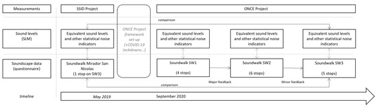 By the time the initiative was officially communicated and launched, on the 7 September 2020, the project had public support and encouragement from not only ONCE and the City Council, but also from the Spanish Acoustic Society (SEA) and the CONAMA Foundation [16]. Colleagues from the UCL (SSID) assisted the UGR research team in the layout first stage of the project development, and valuable suggestions and comments from SEA and CONAMA also helped in this task. Finally, the sound level meter and the 4k/360 video and FOA recording equipment, from the Anechoic Chamber at UGR, were used at no cost, enhancing the project value in the context of social responsibility. Figure 1 graphically summarizes this process.