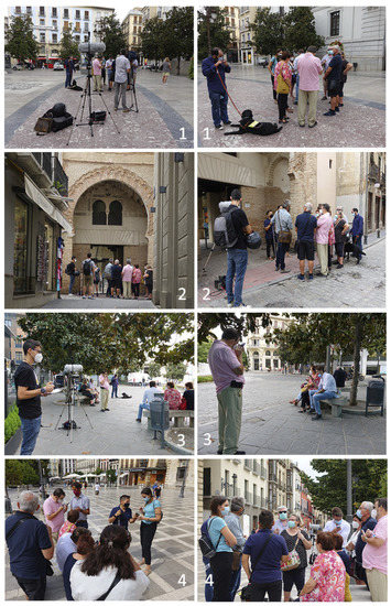 The project began to take shape in early 2020, when initial contacts were established with the ONCE delegation in Granada (ONCE stands for Organización Nacional de Ciegos Españoles, the Spanish national organization for the blind). The project outline, based on the realization of soundwalks, was well-received by ONCE, but was seen from the outset as a major organizational challenge. The COVID-19 lockdown stopped the initiative for some time, until July 2020, when contacts resumed, this time with the collaboration and support of the Granada City Council. The project outline was then approved, the main purpose being to preserve and evaluate city sounds as a resource and, as a second derivative, to fight against noise pollution as a source of bewilderment and discomfort, which gives rise to confusion among the members of the ONCE collective. Participants were selected by ONCE from a call for volunteers in good health conditions for an approximately 2-km-long walk, and the questionnaire was to be adapted by the UGR research team to an online platform that visually impaired people could listen to along the path. Listening to their mobile devices is a common practice by ONCE affiliates in their everyday living.