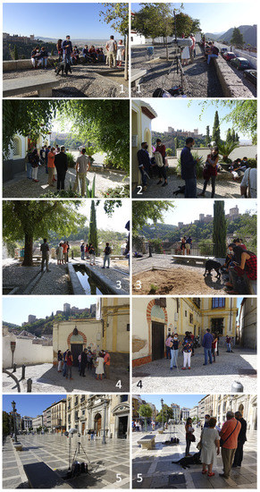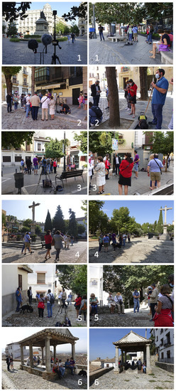 The main characteristics of the soundwalk and the procedure methodology were explained to the participants at the beginning of each walk at the departing site, in a street meeting that took around half an hour. The explanations from the research team to the participants always pointed out the answers to five main questions: (i) The path should be walked in silence, with concentration focused on the surroundings sounds; (ii) Once at the evaluation site, the participants should stay 5 to 8 min in silence, trying to identify the main sound sources and the feelings that these sounds generate; (iii) The participants should answer the questionnaire without haste and without meditating on the answers; (iv) Participants should answer all of the items, without leaving empty questions; (v) Once finished, participants should proceed by walking to the next evaluation site and perform the same steps again. The participants were also informed that, while they were doing the evaluation, the research team would be involved in the audio/video recordings, photographing details of the scenario, registering sound levels, and taking notes for later analysis and as a further reference of the incidences. As this task implied the use of heavy and delicate instrumentation, which had to be transported, set up, and the correct functioning revised from one place to another, the participants were advised to not be in a hurry so that there would be enough time between stop sites to do so. As the participants terminated their evaluations, and before proceeding to the next site, a member of the UGR research team, an expert in Granada urbanism and historical data, would share with them stories, anecdotes, and facts, which turned the walk into an authentic tourist tour around the city, with historical nuances of great interest. This extra activity, not initially planned, stoked the interest of the participants who were really impressed during the first soundwalk, and who demanded it afterwards in the following soundwalks.