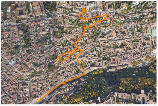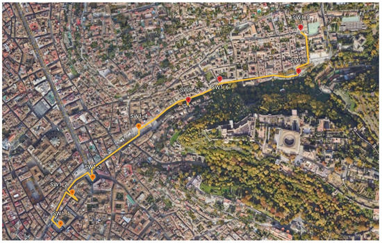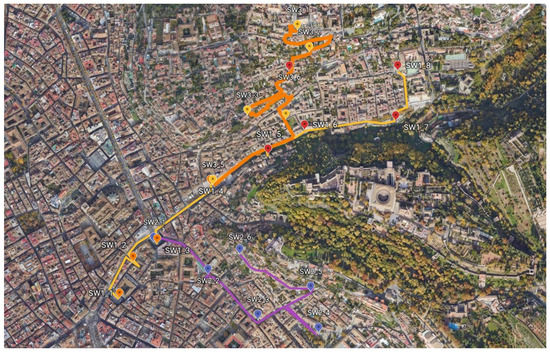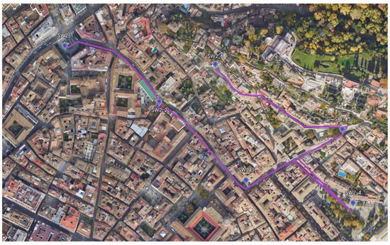 A pictorial view of the soundwalk stop sites can be seen in Figure 2, Figure 3 and Figure 4 for, respectively, the first soundwalk (SW1), the second soundwalk (SW2), and the third soundwalk (SW3). Two views at each stop site are shown in Figure 2 for SW1, in Figure 3 for SW2, and in Figure 4 for SW3. Detailed path descriptions are shown, respectively, in Figure 5, Figure 6 and Figure 7, together with a global view of the three soundwalk routes in Figure 8. The strategic noise map of the city shows a color map of the sound levels along the streets in these figures (follow this link for daytime information: https://sicaweb.cedex.es/docs/mapas/fase3/aglomeracion/GRANADA/Ag_AND_GRANADA_C_Ld.pdf), (accessed on 10 December 2021).
