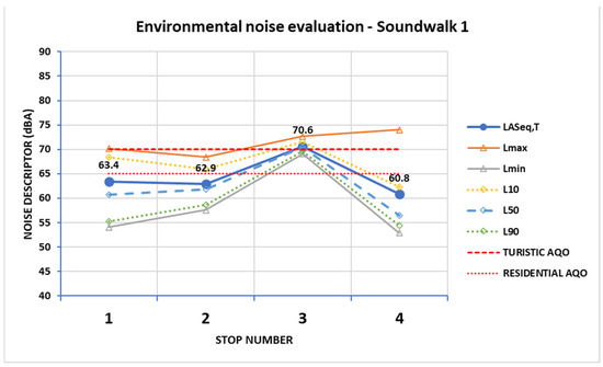 Environmental noise descriptors were derived from measurements made with a RION NL-52EX class 1 sound level meter (see specifications in https://rion-sv.com/products/NL-52_42-E.html, (accessed on 10 December 2021)). The sound-level data consisted of one-second time weighting, slow (S) recordings leading to frequency weighting, A (dBA), and coincident C (dBC) with one-second equivalent (Leq,1s) measurements during a period (T) of 10 min at each stop site. From these measurements, the maximum and minimum levels, LAmax and LAmin, as well as the L10, L50, and L90 percentile levels and the equivalent sound levels for the period, LASeq,T, were computed for the environmental noise characterization. The results are shown in Table 7.