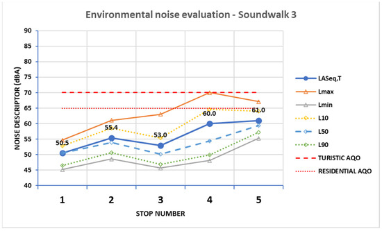 Most of these stop sites are in urban areas, typified as “Residential” or “Touristic” in the acoustic zoning of the city, and the noise descriptors are presented in Figure 9, Figure 10 and Figure 11, together with the acoustic quality objectives (AQO) for these areas, set to, respectively, 65 dBA (Residential) and 70 dBA (Touristic). The effect of the water falling in the fountain located at Site 3 during SW1 can be easily observed in Figure 9, compared to the situation at Site 1 during SW2 in Figure 10. The difference in the ambient noise maximum levels at Site 4 during SW1 are also noticeable, and are coincident with Site 5 during SW3, though they share similar LASeq.