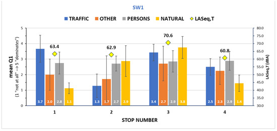 Sound source identification during Soundwalk 1 (SW1). Mean answers with standard deviations as error bars, and the noise equivalent levels at each evaluation site.