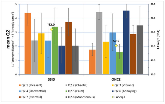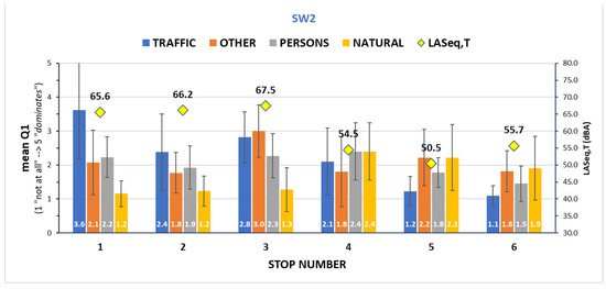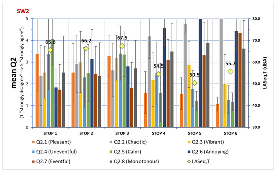 Perceived affective quality during Soundwalk 2 (SW2). Mean answers with standard deviations as error bars, and noise equivalent levels at each evaluation site.