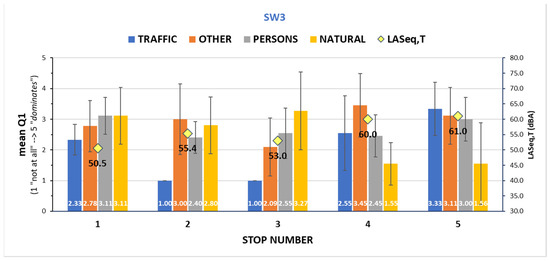 Sound source identification during Soundwalk 3 (SW3). Mean answers with standard deviations as error bars, and noise equivalent levels at each evaluation site.