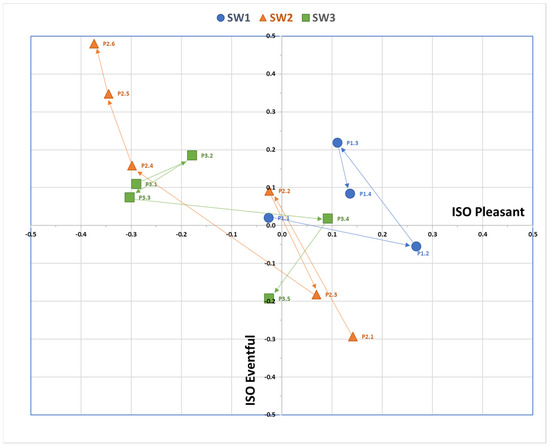 Pleasantness (P) and Eventfulness (E), as derived from ISO 12913-3 formulae and Q2 data, at every stop on the path during SW1, SW2, and SW3—the arrows indicate the sequences of stops during the soundwalks.