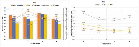 Mean answers to Q3 (overall appraisal), Q4 (appropriateness), and Q7 (loudness), together with environmental noise descriptor information: (left) standard deviations around the means for these answers at each stop site; and (right) during the first soundwalk (SW1).