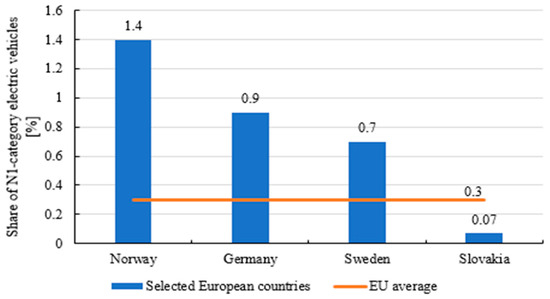 In the Slovak Republic, 269,350 vehicles were registered in the N1 vehicles category as of 22 April 2021. Out of the total number of these vehicles, 182 vehicles, in absolute terms, use electricity as a source of drive. In relative terms, it is possible to state that 0.07% of all vehicles of the given category [2] can be found in the category of N1 light goods vehicles with electric drive in the Slovak Republic. For comparison, it is appropriate to state that, according to ACEA data for 2019, there was a total of 0.3% of electric vehicles in the N1 category in the European Union. Within the EU countries, the largest share of electric light goods vehicles with a total weight of up to 3.5 tons is in Germany (0.9%) and Sweden (0.7%) in Figure 2. However, Norway, which is not subject to the European Union legislative requirements, has the highest share of electric vehicles with a total weight of up to 3.5 tons with the share of these being 1.4% [3].