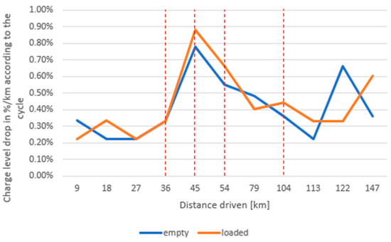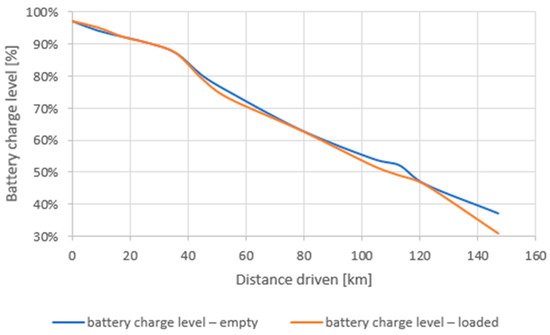 - The difference in drops in battery charge levels between empty and loaded vehicles becomes more pronounced at lower battery charge levels. For longer delivery routes, it is also useful to introduce recharging during unloading in order to achieve recharging above a certain level (e.g., above 50%).
