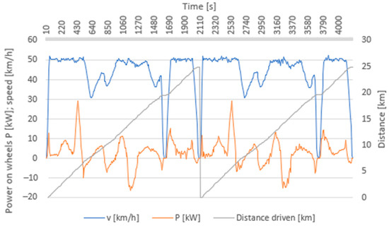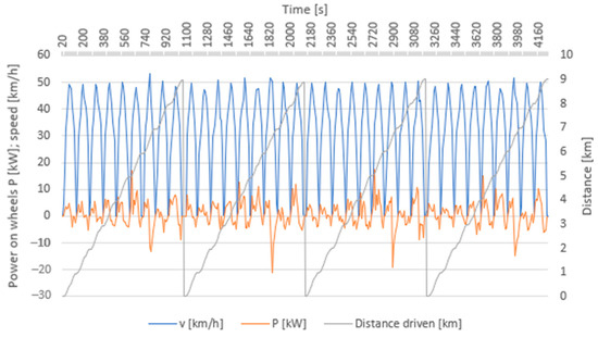 Differences were recorded only in certain peak values for a very short time. Peak values were reached only in cases where there were steeper uphill phases. The same effect was manifested in downhill phases, where there are some differences in vehicle deceleration, when more force is needed to slow down or stop a loaded vehicle, which is further reflected in higher, negative power on wheels, especially in peak values. This effect creates room for a higher rate of recuperation, i.e., energy recovery. However, as is clear from the graphic course, this does not have a major impact in this specific examined driving cycle.