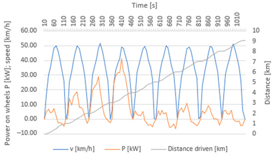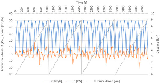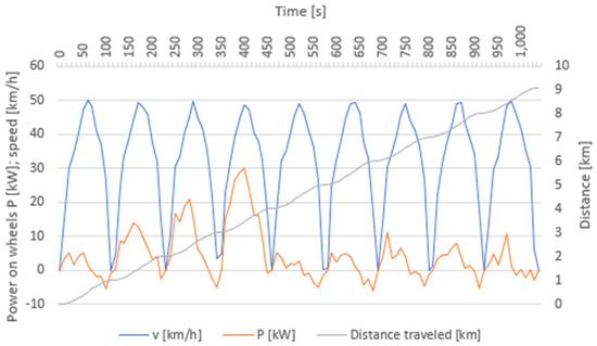 For the purposes of the performed measurements, it was necessary to prepare driving cycles for the whole simulation. The crucial element was a modified urban driving cycle for the city of Žilina based on the course of speed, acceleration, and deceleration in traffic in the city of Žilina. At the same time, it contained a projected vertical profile of the route, which reflects the profile of roads in the city of Žilina. The profile was formed by flat to slightly rolling terrain with several short sections of steeper (up to 12%) downhill and uphill routings. In the measurements, a cycle was approximately 9 km long. The driving cycle was created through real measurements in traffic in the city of Žilina.