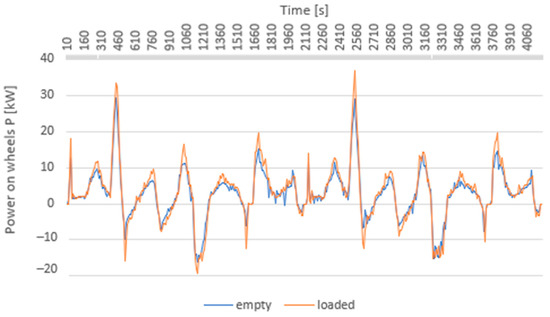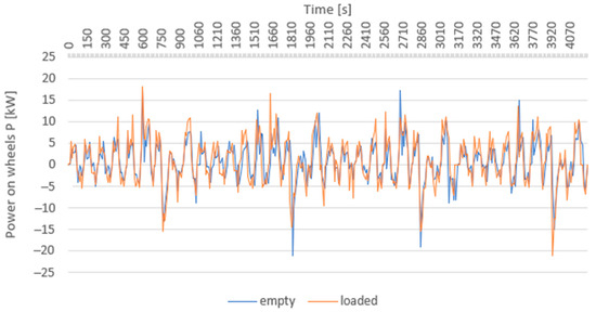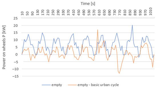 A comparison of the power on wheels for a loaded and empty vehicle makes it possible to state that even in the case of the driving cycle in question, there are no significant differences between an empty vehicle and a loaded vehicle.