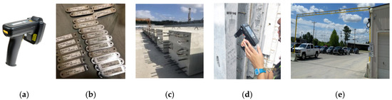 RFID tracking for integrated digital delivery. (a) RFID Reader; (b) RFID Tags; (c) Affixed to components; (d) Read by RFID handheld; (e) Read by fixed RFID portal.