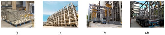 Nowadays, an advanced automated storage system is developed for precast products, as illustrated in Figure 3. Such a storage system can be constructed near the construction site as its material supply point. According to dispatched orders, the precast products are pre-sorted and stored in standard mobile racks, the sizes of which are compatible with the standard truck size. The loaded racks are then placed in the multi-level storage cells waiting for their delivery. When trucks come, overhead gantry cranes move the racks from the cells onto the trucks. IDs of the trucks, racks, and individual precast products are linked once they are physically together. Hence, by knowing the ID of a truck or a rack, IDs of its loaded products are known at once. Overhead RFID solutions, with fixed RFID readers installed in the overhead gantry, which can be installed at the exits and entrances of the plant, storage yard, and site, would automatically collect data remotely when trucks pass by, thus enabling a continuous stream of valuable real-time data.