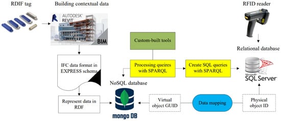 Figure 4 illustrates the method proposed to link RFID to BIM. The BIM model in software such as Revit is represented with the sensor information in the IFC data format in the EXPRESS schema. The IFC needs to be transformed into RDF by transforming an EXPRESS schema into RDF ontology using a semantic web approach. Following the development of the ifcOWL ontology, an IFC-to-RDF converter is developed. The underlying structure of any expression in RDF is a collection of triples, each consisting of a subject, a predictive, and an object. The RDF data are stored in a NoSQL database such as MongoDB database. On the other hand, the timeseries data collected by the RFID reader are stored in a relational database. The two databases are linked by defining the relationship between the virtual object globally unique identifier (GUID) and physical object ID. Last, contextual information represented in RDF is queried by SPARQL, while timeseries data stored in the relational database is queried using SQL. Since contextual information and timeseries data are mapped, SQL queries can be created based on SPARQL queries on RDF data.