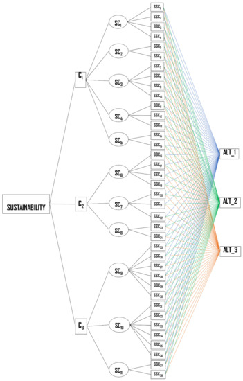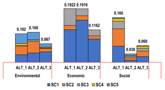 Table 7, Table 8 and Table 9 report performance comparison values for each subcriteria and sub-sub criteria for the three dimensions of sustainability. Comparison tables were generated based on decision-makers’ judgments based on the proposed hierarchy. Performance value calculations for criteria and subcriteria, calculations of aggregations for criteria and sub-sub criteria, as well as final aggregation of the 38 sub-sub criteria with the three alternatives were done to evaluate overall sustainability performance as reported in Section 4. Results are reported as the best alternatives of each criterion and finally as overall sustainability performance.