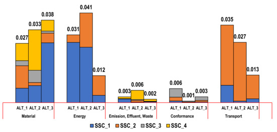 - Skill management (SSC31)—Based on Section 3.4.3, average hours of training and education for specific skill, knowledge, or competence needed (SSC31) varies with the type and hours required depending on the type of manufacturing process. Moreover, Table 1 represents that training is more highly needed for ALT1 than ALT3 and ALT2, respectively. The training needed for ALT2 is not that relevant. Thus, based on this information, decision-makers preferred ALT1 with strong importance concerning ALT2 and moderate importance with ALT3. Moreover, ALT3 was preferred over ALT2 with moderate importance, as per Table 3.