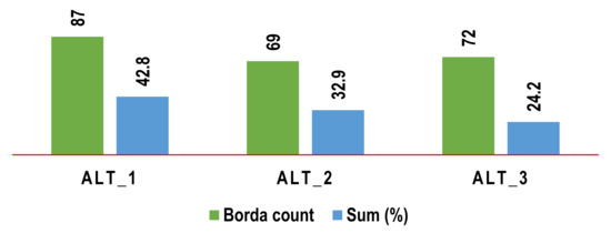 To make final decisions, the Borda count method was introduced for comparison with the sum approach. For some approaches, the scores of each of the 38 sub-sub criteria were added within each sustainability dimension. This results in scores of 0.428 for injection (ranked first), 0.329 for 3D printing (ranked second), and 0.242 for laser (ranked third). However, since the frequency of the rank of each alternative varies, the introduction of the Borda count method assists a decision. Among the 38 sub-sub criteria, the frequency of better preferences for injection molding, 3D printing, and laser cutting for the first choice was 23, 13, and 2, for the second choice was 3, 5, and 30 and for the third choice was 12, 20 and 6, respectively. Thus, scores of Borda count were obtained by adding products of the frequency of the first choice by three and second choice by two, and the third choice by one. This method helps to avoid simple consideration of options that are preferred by the majority and allows considering better performances of other alternatives.