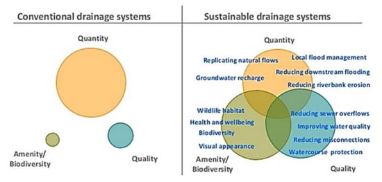 Overall, the risks of flooding are expected to be amplified and sustainable solutions such as sustainable urban drainage systems (SuDS) are quite vital to enhance infrastructure resilience and to support a solid adaptation strategy. The use of SuDS can reduce urban surface water flooding as well as the pollution impact of urban discharges on receiving waters [14,15,16,17]. SuDS are more sustainable than conventional drainage techniques, offering benefits such as attenuation of runoff before concentration, improvement of water quality, maintenance of groundwater recharge rates through infiltration and minimization of flood impacts on the environment. In urban areas where many surfaces are sealed by buildings and paving, natural infiltration is limited. Instead, drainage networks consisting of pipes and culverts divert surface water to local watercourses. In some cases, this has resulted in downstream flooding and deterioration in river water quality caused when foul sewers are overwhelmed by surface water leading to a release of dirty water into rivers [18,19,20,21]. Drainage systems need to adapt to and manage extreme events including flooding and periods of drought while helping to reduce carbon emissions. Storage of runoff within a SuDS system is essential for providing the extended detention of flows for water quality treatment, as well as for peak flow attenuation of larger flows for flood protection downstream of the site. Runoff storage can be provided within an on-site system through the use of structural controls and/or non-structural features and landscaped areas [22,23,24,25].