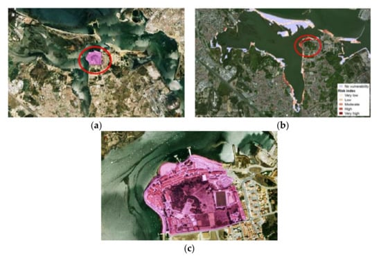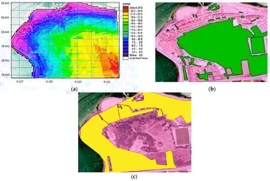 (a) Location of the case study; (b) risk index in Seixal bay; (c) contour of the studied area.