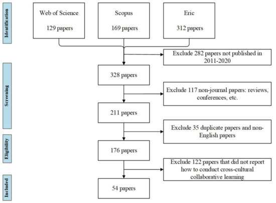 The inclusion and exclusion criteria were set based on research purposes to determine the papers appropriate for this study. Therefore, to meet the eligibility criteria, a research paper first had to involve participants in a cross-cultural collaborative learning or cross-cultural collaboration activity. Next, the papers had to include information related to how to conduct cross-cultural collaborative learning. Then, the publication date had to be from 2011 to 2020. The following steps were followed for the selection process: