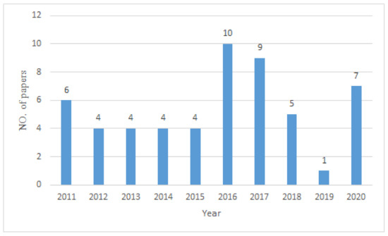 The selected papers were examined for quality which, according to Yeh and colleagues [37], is how well the research was designed and executed. There were cross-cultural collaboration studies that did not include group activities and interaction and therefore were rejected. Figure 1 shows the paper selection process. Finally, 54 literature papers were retrieved from the searched 610 papers. The distribution of the number of papers found from 2011 to 2020 is presented in Figure 2 below.