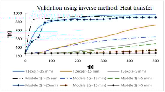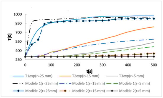 The pyrolysis model was validated against the experiments of Larfeldt et al. [21]. The latter presented measurements of temperature distribution and mass loss on dry, solid wood cylindrical samples during pyrolysis in an inert atmosphere heated to 973.15 K. They considered cylindrical birch wood samples with a radius of 25 mm, a length of 300 mm and an average density of 410 kg/m3. Figure 1 presents the wood temperature evolutions at the surface (r = 25 mm), at 5 mm, and 15 mm to the axis of the cylindrical wood. In general, temperature increases from the surface to the center because parts near the surface are more heated than parts far from the surface. Model 1 (one-reactional model) gives acceptable results that are more satisfactory than model 2 (multi-reactional model).