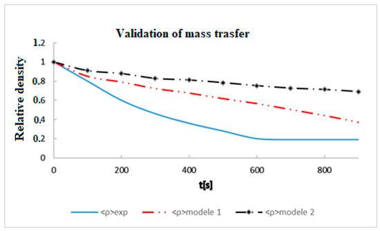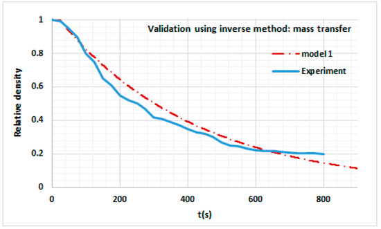 Wood relative density evolutions versus time of process of a sample of cylindrical wood and validation using Model 1 and experimental data taken from Larfeldt et al. [21]. A = 1 × 105 s−1, E = 127.4 kJ/kg.