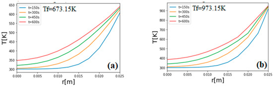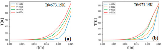 Heat transfer gradient using Model 1 at Tf = 673.15 K (a) and Tf = 973.15 K (b).