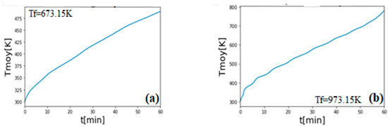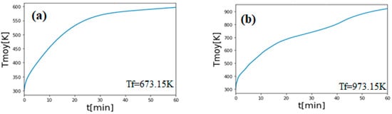 Evolution of average temperature versus the time of process using Model 1 at Tf = 673.15 K (a) and Tf = 973.15 K (b).