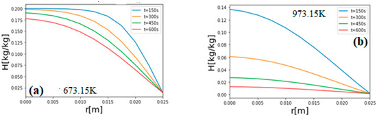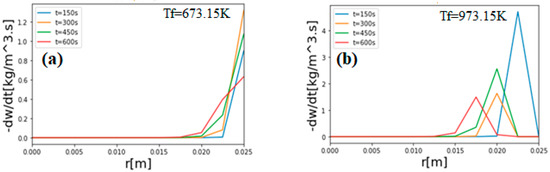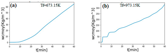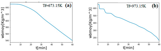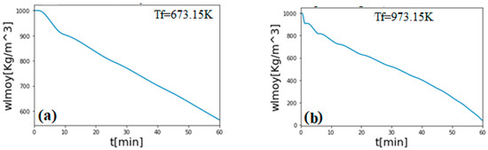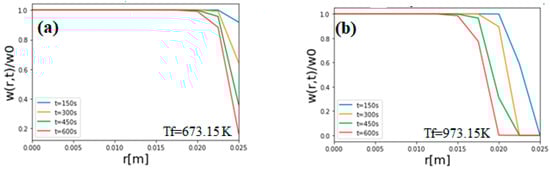 Figure 7 presents the evolution of the wood’s relative density at 673.15 K and 973.15 K. After 600 s, only 5 mm of the wood is degraded when the temperature of the oven is equal to 673.15 K (see Figure 7a). At 973.15 K, 10 mm of wood is degraded, with 5 mm entirely degraded (see Figure 7b). A high heating temperature accelerates the degradation process. Using a low radius of wood particles with integration of the oxidation of char, Benkoussas et al. obtained the similar variations [27].