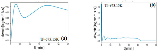 Evolution of the velocity of degradation using Model 1 at Tf = 673.15 K (a) and Tf = 973.15 K (b).