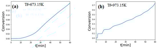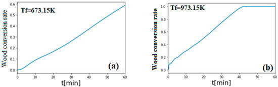 Wood conversion rate versus the duration of the process using Model 1 at Tf = 673.15 K (a) and Tf = 973.15 K (b).