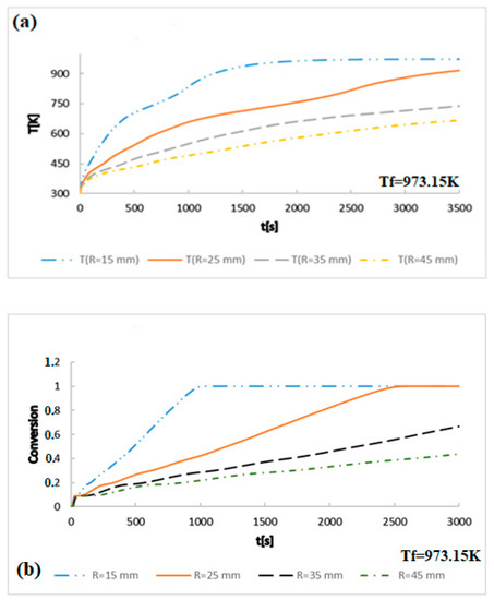 Figure 11 presents the influence of the size of cylindrical wood on the evolution of temperature (Figure 11a) and wood conversion rate (Figure 11b) at Tf = 973.15 K. When the mass of wood increases, temperature takes time to heat all of the product. After 1000 s, all cylindrical wood of 15 mm radius is totally transformed, 2500 s are needed to totally transform a cylindrical wood with 25 mm of radius, while after 3000 s cylindrical wood with a radius higher than 35 mm is not totally transformed. The temperature increases more rapidly with small diameter samples as observed by Preau [24] in his experiments on the pyrolysis of solid wood samples.