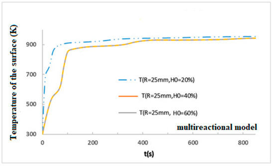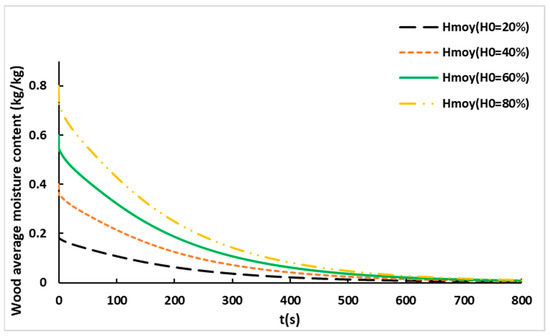 Figure 12 presents the influence of initial moisture content on the surface temperature of cylindrical wood versus the duration of the process using Model 2 (multi-reactional model) at Tf = 973.15 K, R = 25 mm, RH = 0.3. When the wood is in non-hygroscopic domain (moisture content higher than 30%), free water is rapidly dried on the surface and evolutions of temperature at the surface of the cylindrical wood are almost the same. In hygroscopic domain (moisture content lower than 30%), the surface of the wood heated rapidly. However, after 400 s all curves align because the effects of the initial moisture content have been cancelled. Figure 13 shows that average moisture content in the cylindrical wood decreases exponentially and all curves align after 400 s. The samples are totally dried after 800 s. Figure 14 shows the distribution of temperature during the process at five positions of the cylindrical wood using Model 2. It is clear that wood samples will degrade progressively from the surface to the center because temperature takes time to heat internal parts of the cylindrical wood. After 500 s, the temperature of the surface is near the temperature of the source (973.15 K) but the temperature at the center has not changed. After 3500 s, the temperature of the position located at 10 mm to the axis of the cylindrical wood is equal to 750 K. Literature also shows similar experimental results [24].