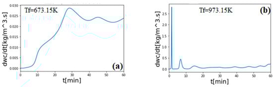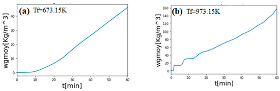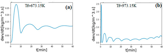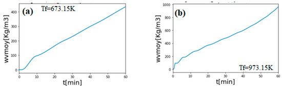 Figure 23 presents the wood conversion rate versus duration of the process in the two studied temperatures. It is clear that when the temperature of the source increases, wood is degraded rapidly. Thus, charcoal, gas and water vapor are also rapidly produced (Figure 24, Figure 25 and Figure 26). At 673.15 K, the average velocity of charcoal production increases progressively until 0.025 kg/(m3.s) and oscillates near this value. When Tf = 973.15 K, a great variation is presented during the first 10 min of the process before reaching a stability near 0.1 kg/(m3.s). These two variations are also seen during production of gas and water vapor. At a given temperature, water vapor is more rapidly produced than charcoal, and charcoal more rapidly produced than gas (Figure 24, Figure 25 and Figure 26).