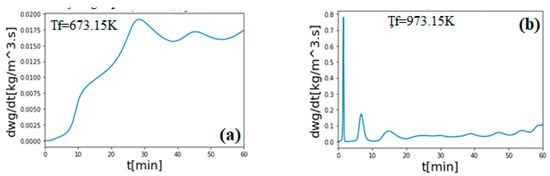 Average velocity of gas production versus duration using Model 2 at Tf = 673.15 K (a) and Tf = 973.15 K (b). RH = 0.3%/100, R = 25 mm and Ho = 20%.