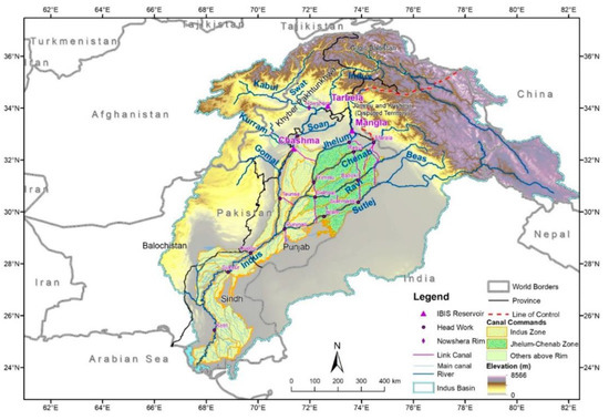 - Podger, G.M.; Ahmad, M.-u.-D.; Yu, Y.; Stewart, J.P.; Shah, S.M.M.A.; Khero, Z.I. Development of the Indus River System Model to Evaluate Reservoir Sedimentation Impacts on Water Security in Pakistan. Water 2021, 13, 895. [Google Scholar] [CrossRef]
