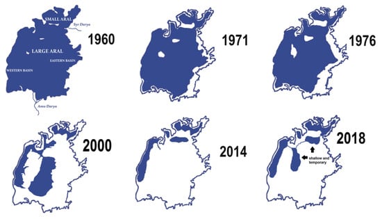 - Aladin, N.V.; Gontar, V.I.; Zhakova, L.V.; Plotnikov, I.S.; Smurov, A.O.; Rzymski, P.; Klimaszyk, P. The zoocenosis of the Aral Sea: Six decades of fast-paced change. Environ. Sci. Pollut. Res. 2019, 26, 2228–2237. [Google Scholar] [CrossRef] [Green Version]