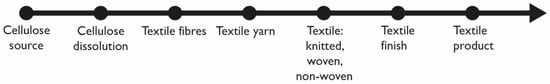 Illustration showing the stages of textile fabrication from raw material to textile product in the existing regenerated cellulose textile value chain.
