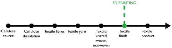 ‘Finishing’ is defined here as chemical and mechanical modifications in woven, knitted or nonwoven textiles including printing, dyeing, thermosetting, pleating or chemical cross-linking processes. In this section, finishing describes printing fabrics. Textile design and materials science collaborations in the DWoC programme at Aalto University saw, with the help of a 3D-printer, the printing of cellulose onto fabric for textile finishing [3,23]. These projects demonstrated that the regenerated cellulose can replace synthetic materials in this process. 3D printers require thermosetting material properties and, therefore, the cellulose sources were adapted to the print process by the materials scientists: the projects used cellulose derivatives such as cellulose acetate, hydrogels, nanocellulose, cellulose-based plastics and pulp fibre composite [3]. Figure 2 maps how 3D printing on fabric takes place at the finishing stage in the textile value chain.