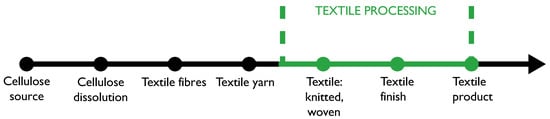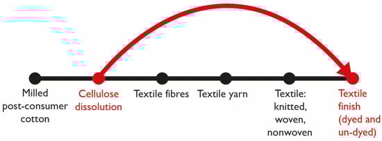 There is a gap in research and industry projects exploring beyond the transformation of cotton textile waste into regenerated cellulose fibres, such as when these fibres become the feedstock for future lifecycles. Currently, recent scientific developments of regenerating cellulose fibres from end-of-life textiles are reaching a commercial scale. In 2015, the percentage of wood-based cellulosic fibres in the global market sat at approximately 6% compared to the 25% of fibres using cotton production [7,13], but a bioeconomy of biologically derived materials is predicted to increase with the production of manufactured cellulosic fibres [7]. Pioneering projects have been able to develop high-quality, regenerated cellulose fibres from cotton textile waste [9,14,15,16,17], as well as fibre blends [18], cardboard and paper [4,5,19]. These projects are listed in Table 1. Since the scientific developments of these materials are recent, the current chemical recycling of cotton textiles will only be full-scale commercially by 2030 [8]. Re:newcell in Sweden opened a pilot recycling plant in 2017. The plant can transform 7000 tonnes of textiles waste into biodegradable pulp each year [9] and has launched a commercial product ‘Circulose’ that is obtained from waste denim in 2019 [20]. Research and funding are invested in projects such as Ioncell in order to upscale their recycling processes to reach a commercial scale by 2025 [14].