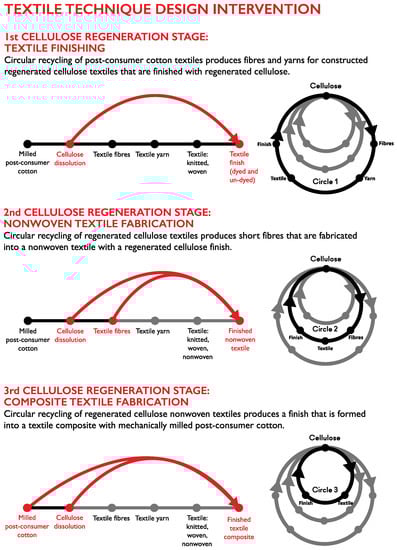 This section describes where, with the cooperation of materials scientists, textile design projects exploring regenerated cellulose from waste textiles take place in the textile value chain from the cellulose source to the finished textile product. Section 3.1 describes projects that introduce regenerated cellulose into existing textile fabrication and finishing techniques. Section 3.2 maps the fabrication and finishing techniques resulting from the author’s research in relation to their intervention in the textile value chain [21]. It demonstrates the framework for early interventions in the value chain in consecutive regeneration stages.