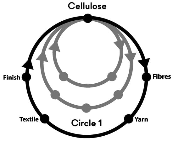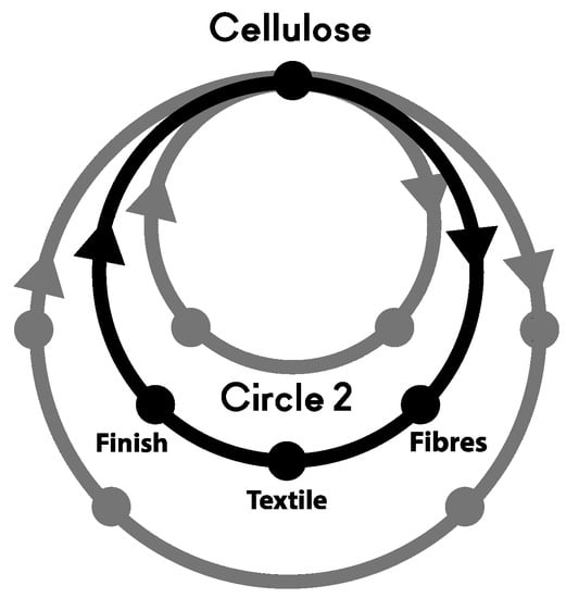 Finishing technique in Circle 1 is the first cellulose regeneration stage after circular recycling of post-consumer cotton textiles [21].